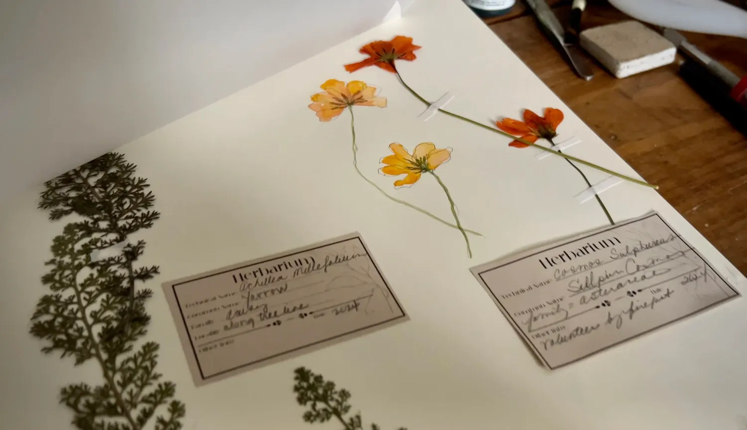 To attach the specimens, I use acid-free linen tape—it's archival, secure, and won’t damage the plant over time. This keeps the natural pieces intact while still allowing the page to breathe.